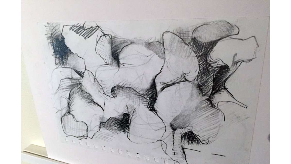 After spending years hiking in the Bitterroot Mountains of Montana, the elements she came in contact with inspired her drawings. “There is stone and there is ice, rain, lots of wind, restless ground.”
