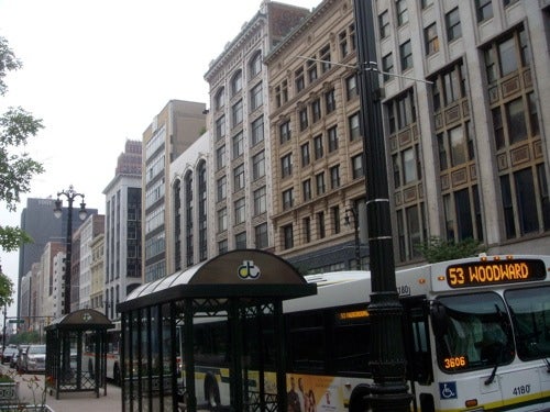 A closer look at the row of stores across the way, though, reveals that every last one of them is abandoned and boarded up. Where to go instead? A block to the west, the concrete swoop of the city’s famed “people mover” beckons, and a little red caboose makes its way into a striking contemporary structure with tent-like canopies and cable-railed stairways. The brand-new Rosa Parks Transit Center, designed by Parsons Brinckerhoff Michigan, puts Philadelphia’s grimy and sad bus terminal to shame.