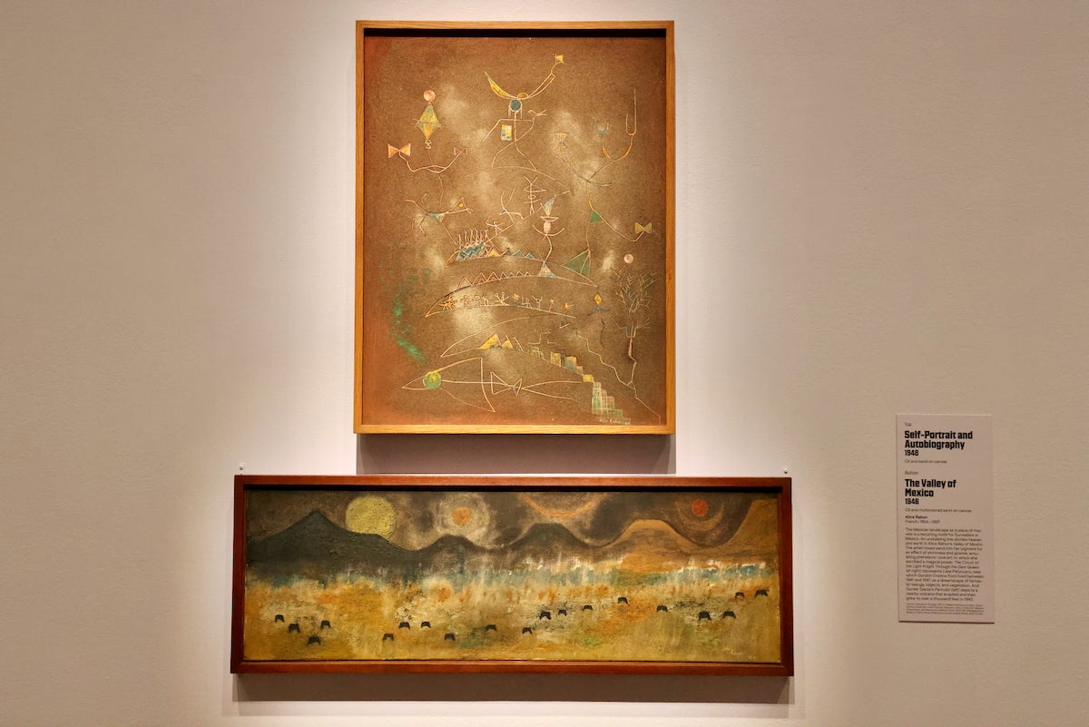 Affron included a small painting by Frida Kahlo, “My Grandparents, My Parents, and I” (1936), which shows the artist as a young girl tethered to her ancestors by a red ribbon. While Kahlo did not subscribe to Breton’s manifesto, he considered her work as authentic expressions of surreality, once quipping that “Mexico is the surrealist country in the world.”