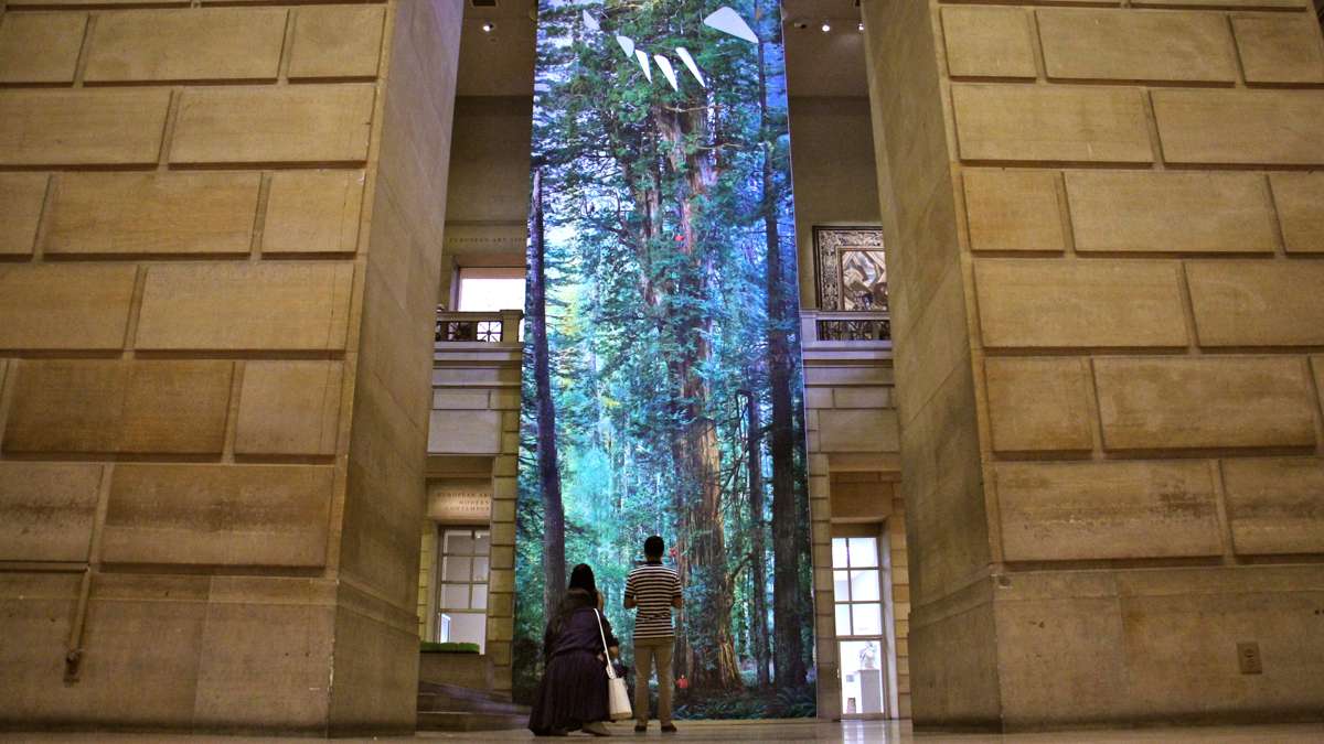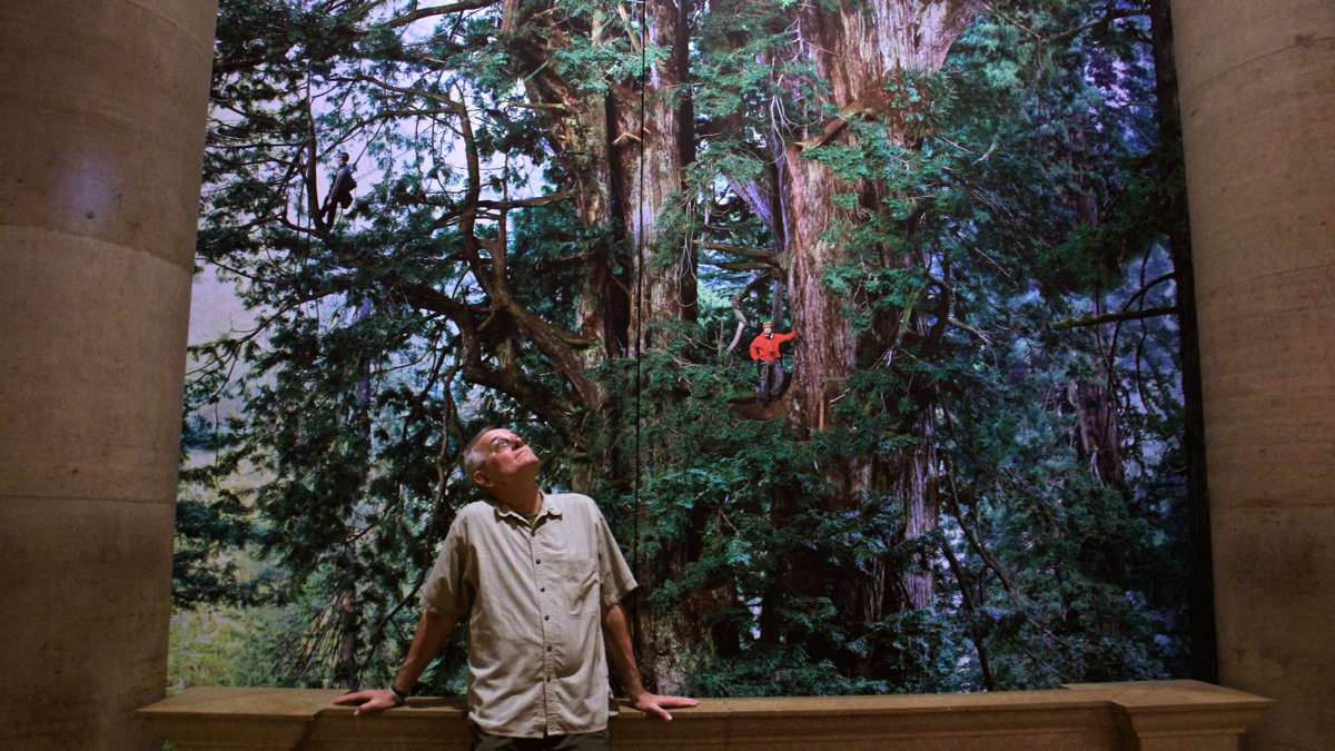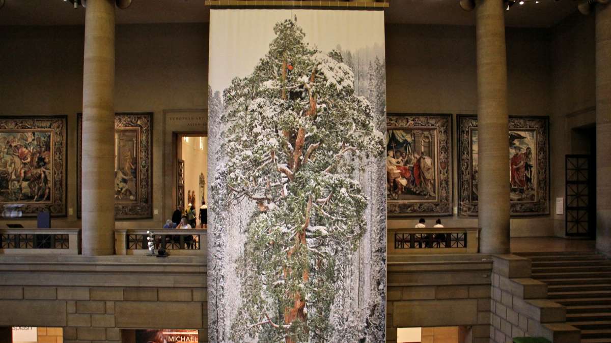 While Nichols never shot with the intention of a museum installation, he always wants his photos to be big. He made full-length images of redwood trees hundreds of feet high, by stitching together multiple shots. They were originally used in National Geographic as fold-out images a couple feet long, but at the Art Museum, they were made into banners 60 feet high, dominating the Great Stair Hall.