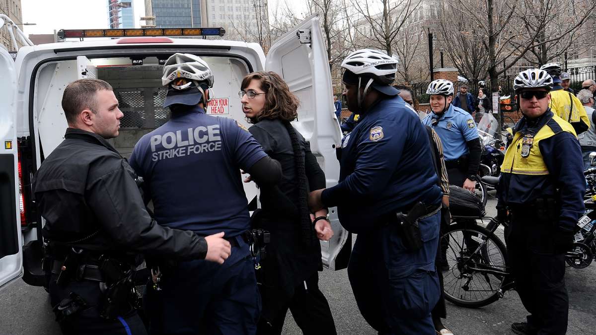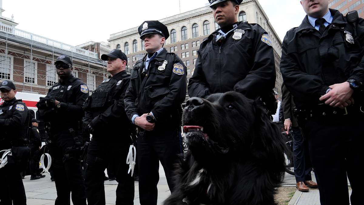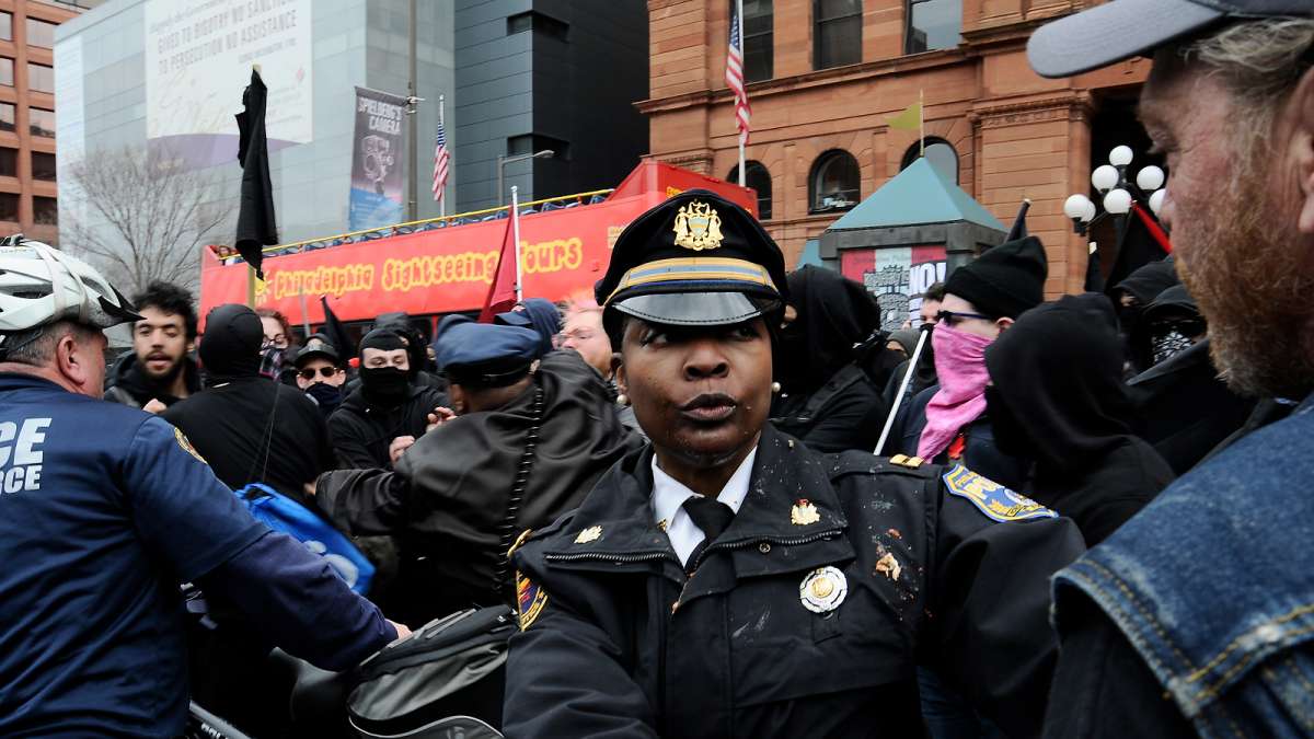 He forced the march to turn around at 16th and JFK Boulevard — about halfway to the Art Museum steps — as bicycle police formed two columns on either side of the protestors to protect them from counter-demonstrators.