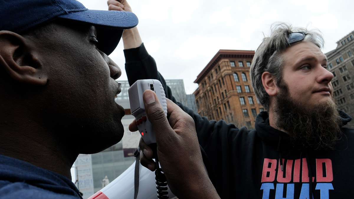 Demonstrators who support President Donald Trump and those protesting his policies converge in Philadelphia Saturday. (Bas Slabbers for NewsWorks)