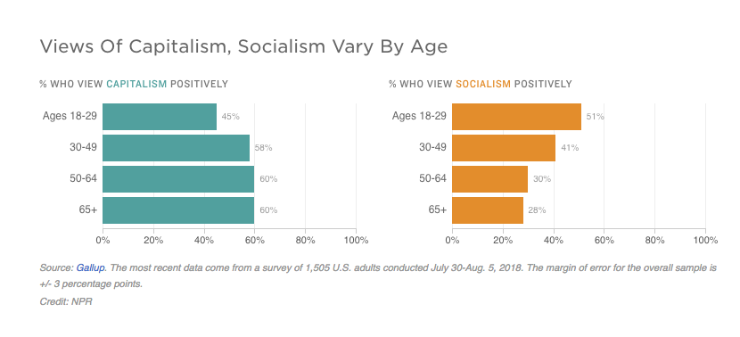 There is a huge generational divide: A majority of young people, those aged 18 to 29, see socialism positively and have a dimmer view of capitalism. Older Americans have a more sharply negative view of the term — 41 percent of those aged 30 to 49, 30 percent of those aged 50 to 64 and just 28 percent of those 65 and older view it positively.