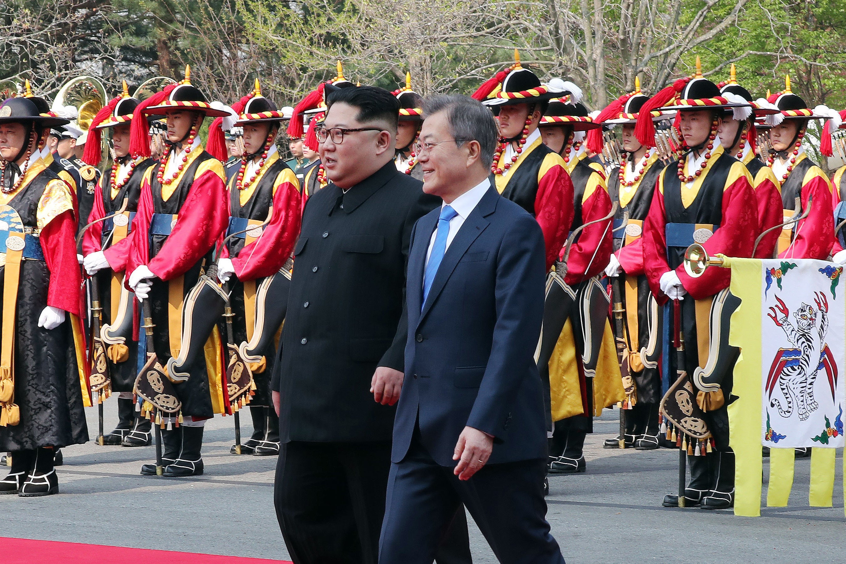 They walked side by side down a red carpet, observed a brightly-colored traditional Korean honor guard ceremony, before proceeding into the three-story Peace House for their summit.