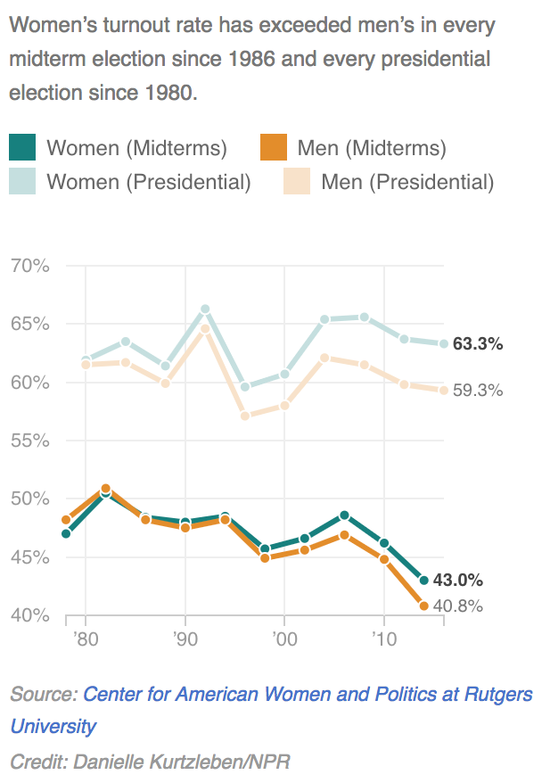 It’s nothing new for women to be politically active — women’s turnout rate has outstripped men’s in every presidential election since 1980, and in every midterm election since 1986. (In terms of raw numbers, women have outvoted men in every national election since at least 1964. These days, that gap is several million every election year.)