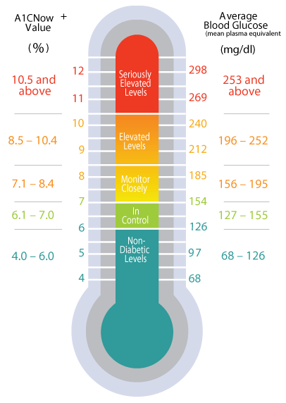 The cartoon image indicates different A1C levels. Elevated levels are represented at the top in hot red and orange colors. “In control” or “non diabetic” A1C levels are shown in cooler green and blue colors.